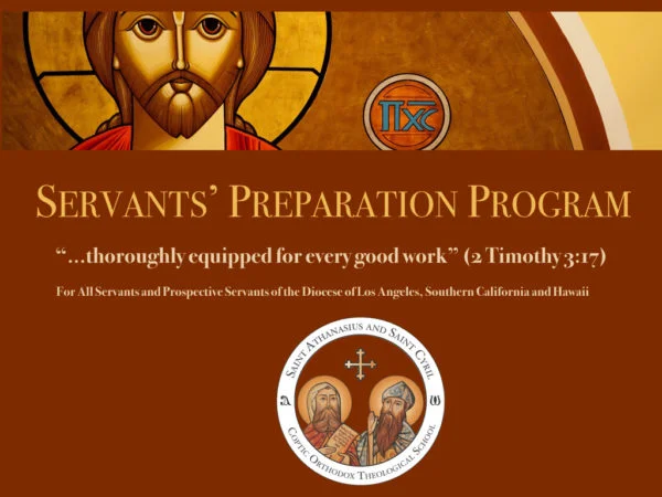 St. Athanasius and St. Cyril Coptic Orthodox Theological School joyfully announces the launch of the Servants Preparation Program for the Diocese of Los Angeles, Southern California and Hawaii. This program is designed to provide existing and future servants of the Diocese with basic knowledge and fundamental building blocks for service.